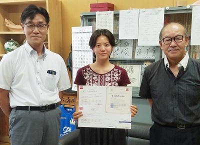 2年生のミルドレンさんが、1級に合格しました。表彰式の後で、「ライテイングの準備が大変でした。父親に見てもらいながら力がつきました」と語ってくれました。将来はインターナショナルスクールの教員をしたいという目標を持っており、資格をとれる大学への進学を考えていると抱負を語ってくれました。