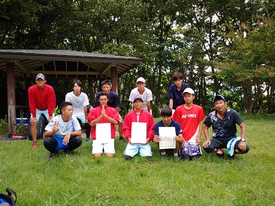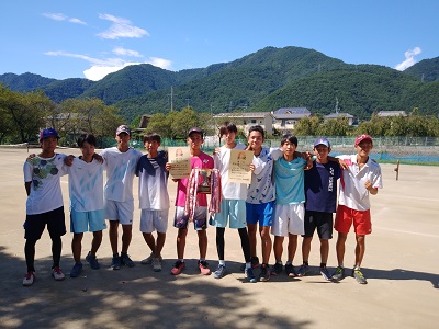 8月26日に長野市で行われた信越大会(主に東北信、一部新潟県からも参加の大会)において、3組が予選リーグから決勝トーナメントに進出。輿水・横関組、坪井碧来(1年)・小西挑(2年)組はトーナメント初戦で敗退したものの、荒井佑斗(2年)・村中滉(1年)組が順調に勝ち上がり準々決勝に進み、その試合の途中で雷雨のため翌日に順延となり、翌日の試合も決勝戦まで見事に勝ちきり優勝を飾りました。2年に代替わり後のチームとしては初めての優勝となりました。9月半ばの新人戦の本番に繋げていけるよう、チーム全員で力を合わせて頑張ります。