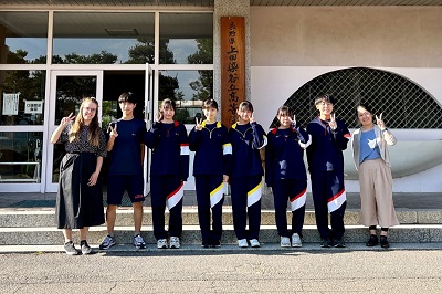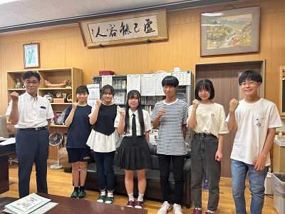 左から、ALTサリー先生、普通科2年湯本瑛仁君、国際教養科2年緑川友香梨さん、国際教養科1年小川泉さん、水口紗世さん、普通科2年関結香さん、国際教養科2年堤康太君、英語科教員村山先生)