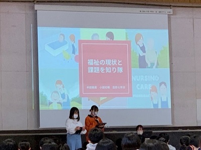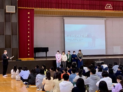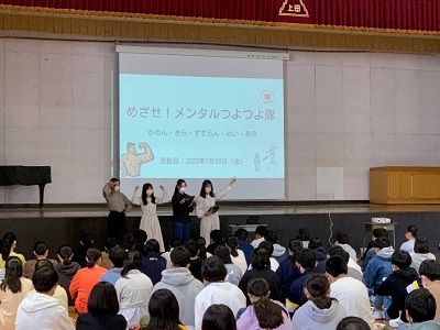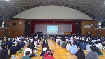 4月28日(金)第一体育館で、3年生が「後輩へ探究学習を取り組みを伝える」をテーマに、代表6グループ(①「ぱんとりーソメヤPJ」②「上田の地理について知る」③「曲を作ってみ隊」④「ボランティアをし隊」⑤「福祉の現状と課題を知り隊」⑥「目指せ!メンタルつよつよ隊)が1年生へ発表を行いました。本校の校歌の中にある「いざや学びて遊ばまし」~自分の好きを学びに~をテーマに1年間課題追究してきた3年生の姿はさすがでした。