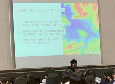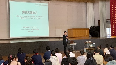 具体的な課題追究に入る、2年生は、信州地域デザインセンター(UDC信州)より倉根明徳さんにお越しいただき、探究の進め方についてガイダンスを行っていただきました。身近なことに疑問を持つことの重要性、好きなことをとことん突き詰めることや、どんなことでも探究になるというテーマ設定についてなど、非常にわかりやすくワクワクするような内容のお話でした。